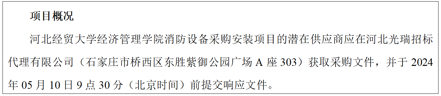 凡有意参加投标者,请于2024年04月29日至2024年05月08日,每日上午09:00时至11:30时,下午14:00时至17:00时(北京时间,下同),河北光瑞招标代理有限公司(石家庄市桥西区东胜紫御公园广场A座303)获取招标文件。