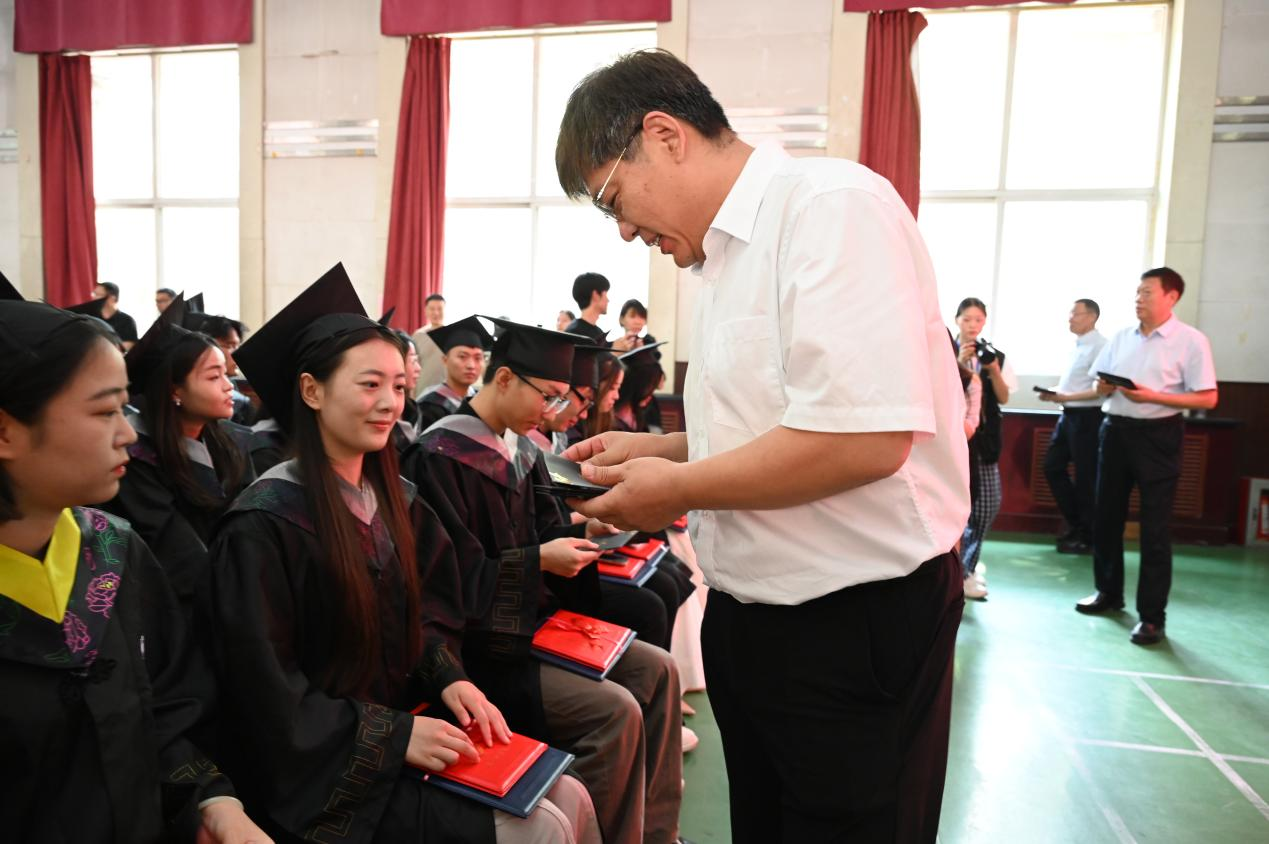 6月12日上午,开云官网2025届大学生毕业典礼在学院礼堂隆重举行。校党委副书记王保军出席典礼,学校办公室副主任傅昕、学院领导、各系部负责人及毕业班辅导员、毕业生代表500余人参加。典礼由院党委副书记刘佳主持,院长李大庆致辞,副院长王鸿喜宣读了2025届优秀毕业生表彰文件。