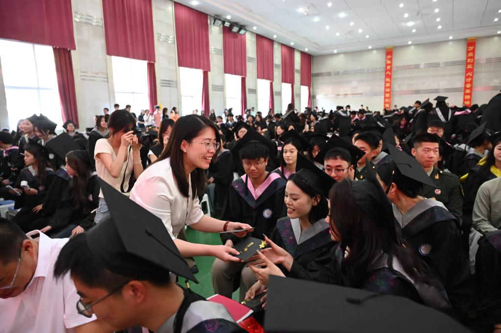 “亲爱的毕业生们,梧桐叶上三更雨,叶叶声声是别离……”一部由学院多部门联合打造的视频短片《2025 情书》的播放,让在场的毕业生瞬间破防。视频中展示了老师和学生的双向表达,包含着师长的期许和学生的感恩之情。典礼结束,校院领导走下主席台和毕业生握手言别,并为同学们送上一套写给毕业生的情书。