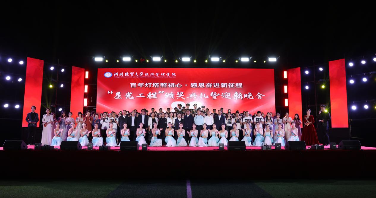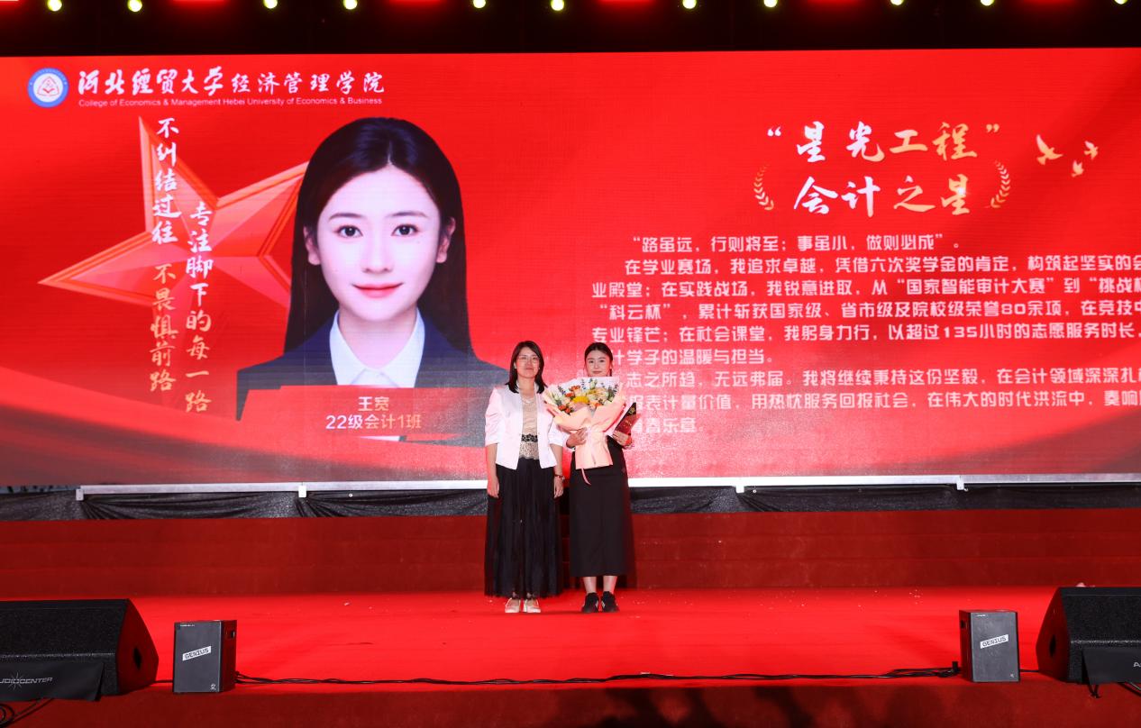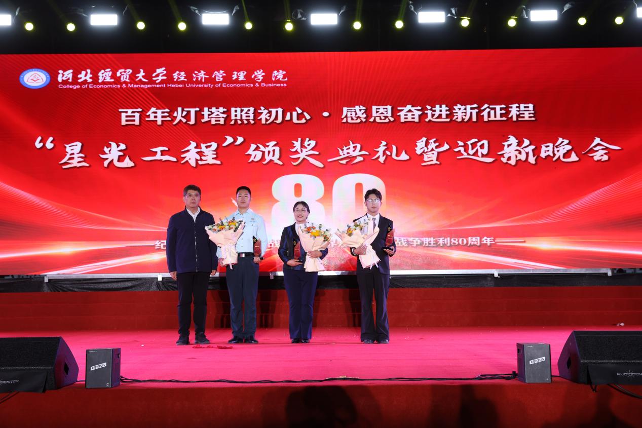 晚会中的“星光工程”颁奖环节备受关注。经过严格遴选,多位优秀经管学子脱颖而出:经济之星李帅、商务之星郭蕴兴、文法之星张怡然、信息之星张佳瑶、管理之星王涵、会计之星王宽;文法系文法融媒团队荣获团队之星;现任河北省军区文员参谋、2017级行政管理专业学生吕朝阳获评校友之星;会计系主任王慧霞老师被授予育人之星。学院领导依次为获奖者颁奖,勉励他们继续发挥榜样作用,带动全院师生共同进步。一位2025级商务系新生激动地表示:“大学四年,我将以优秀学长学姐为榜样,勤奋进取、全面发展,不负青春韶华。”