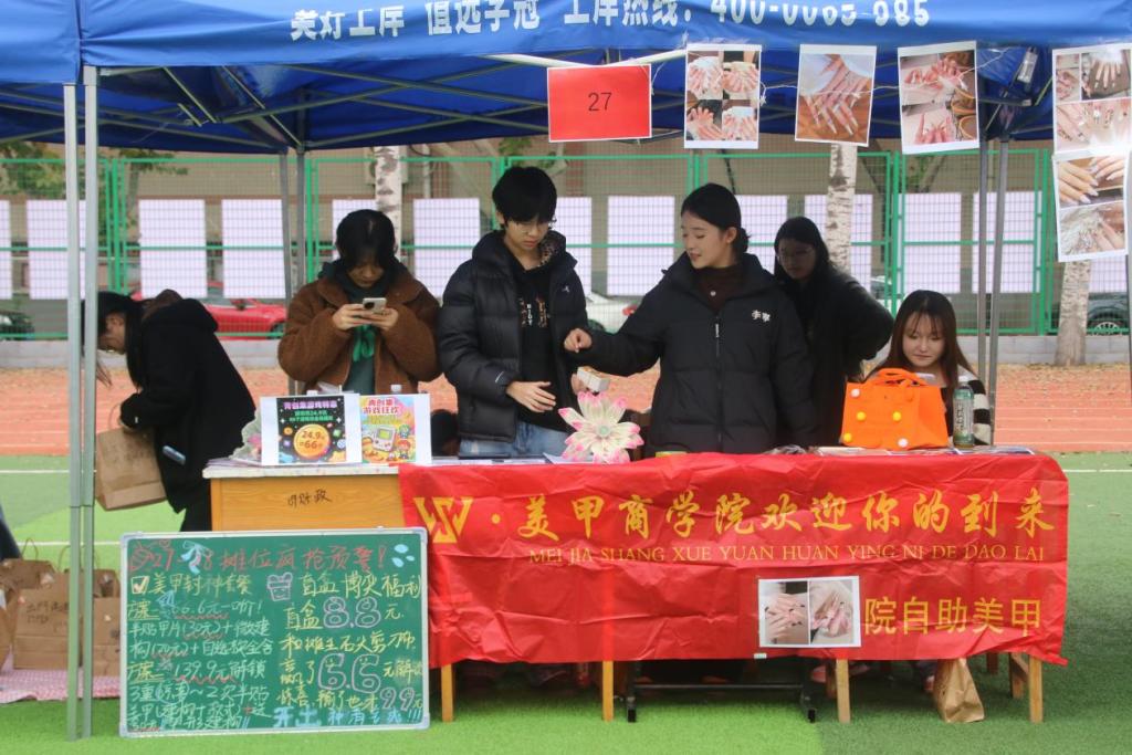 24金科一班的手工绒线花艺摊位人气颇高,其创意源于宿舍同学的集思广益,从“想法”到“产品”的制造过程,正是劳动创造价值的生动体现。23级工商2班韩宏伟同学的“创意盲盒”摊位成为全场焦点之一,他介绍道:“我们前期做了简单的市场调研,发现‘小成本、大惊喜’的模式最受同学欢迎。3元的定价策略、抽奖的促销方式,都经过了监管小组的报备与认可,让大家买得放心、玩得开心。”在时尚专区和生活用品区,同学们带来的特色美甲、精致小物也备受青睐,从原材料采购到成品制作、定价销售,这一完整的劳动过程让同学们深刻体会到创造与经营的不易。