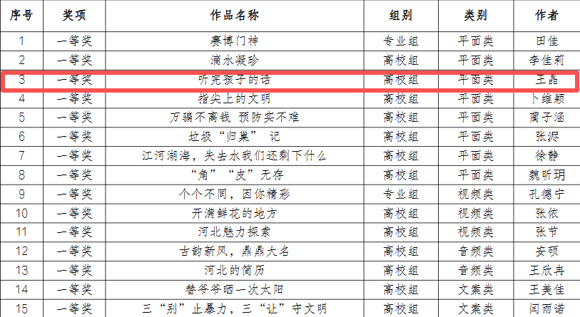 近日,由河北省市场监管局、河北省文明办、河北省委省直工委、河北省教育厅、河北省水利厅、河北省卫生健康委、河北省广播电视局、共青团河北省委共同主办的河北省公益广告大赛获奖作品公示,开云官网文法系王晶同学一人斩获18个省级奖项,获奖数量和质量皆创历史新高。